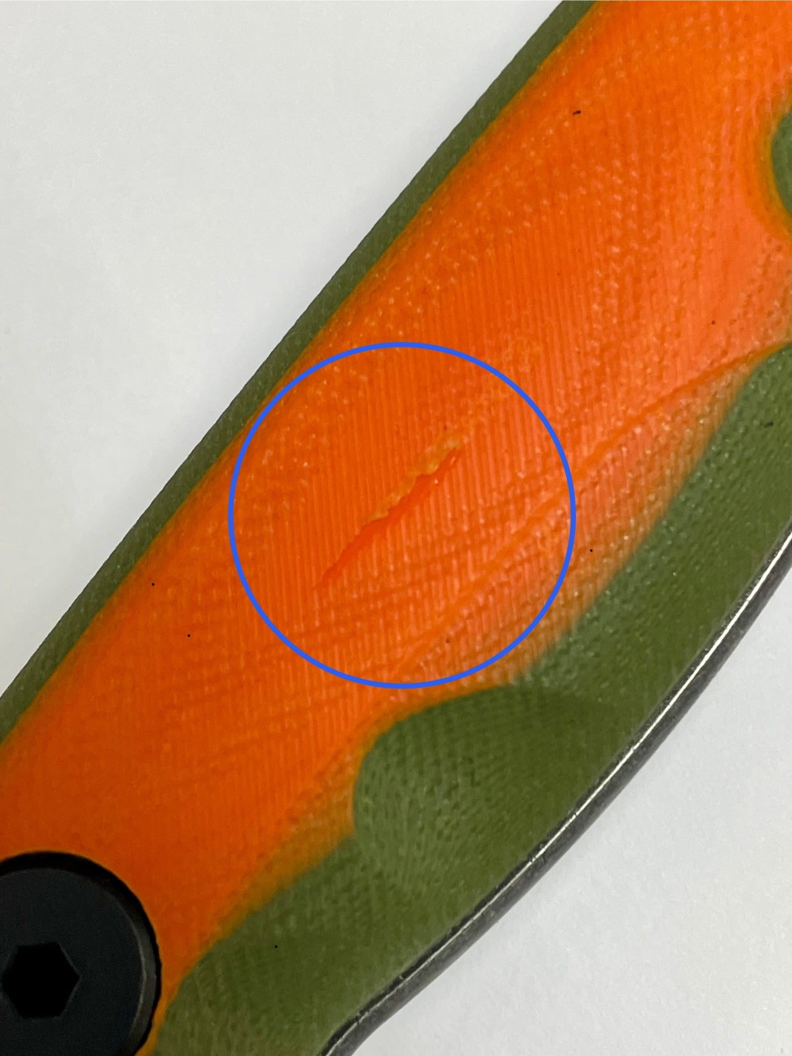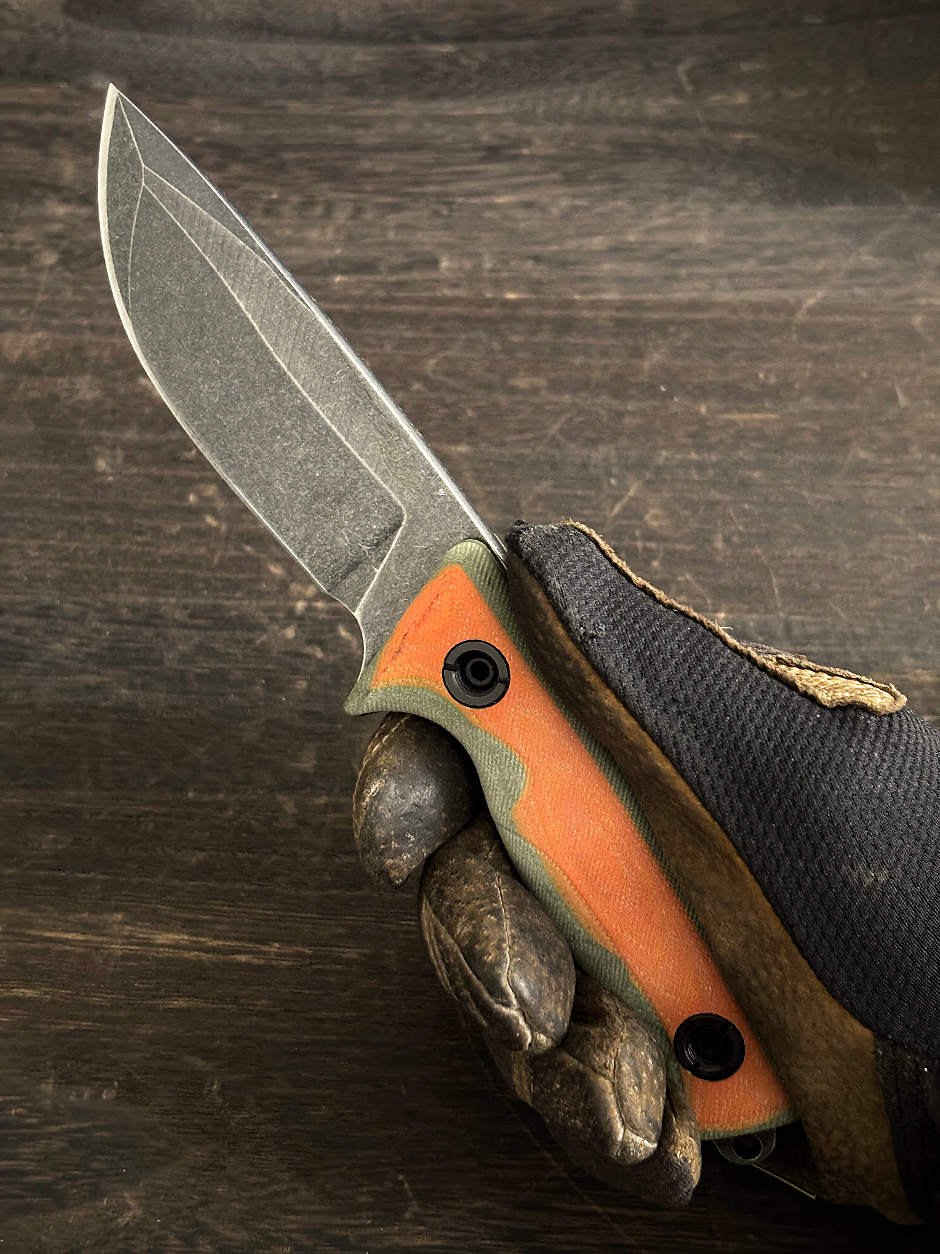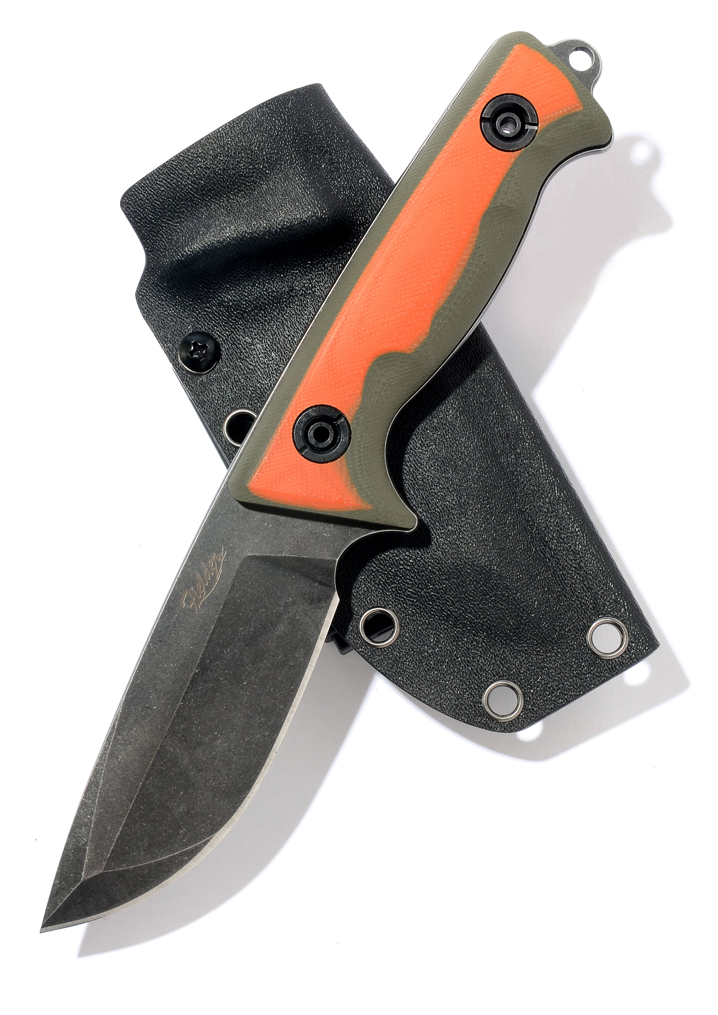 ガラス繊維を積層してエポキシ樹脂に浸し、高温高圧で硬化させたG10ハンドル材は、水を吸わず、軽量かつ高強度で、グリップ力も高いというアウトドアナイフに最適なマテリアル。ハンドルからわずかに鋼材が飛び出したフルタング構造と相まって、バトニング時にハンドルを叩いてしまっても全く問題にならないタフさが魅力です。また、グリーンおよびオレンジの積層G10材を削り出したツートーンハンドルは、タクティカルギア然とした佇まいを演出しつつも、フィールドで見つけやすい色合いとなっています。