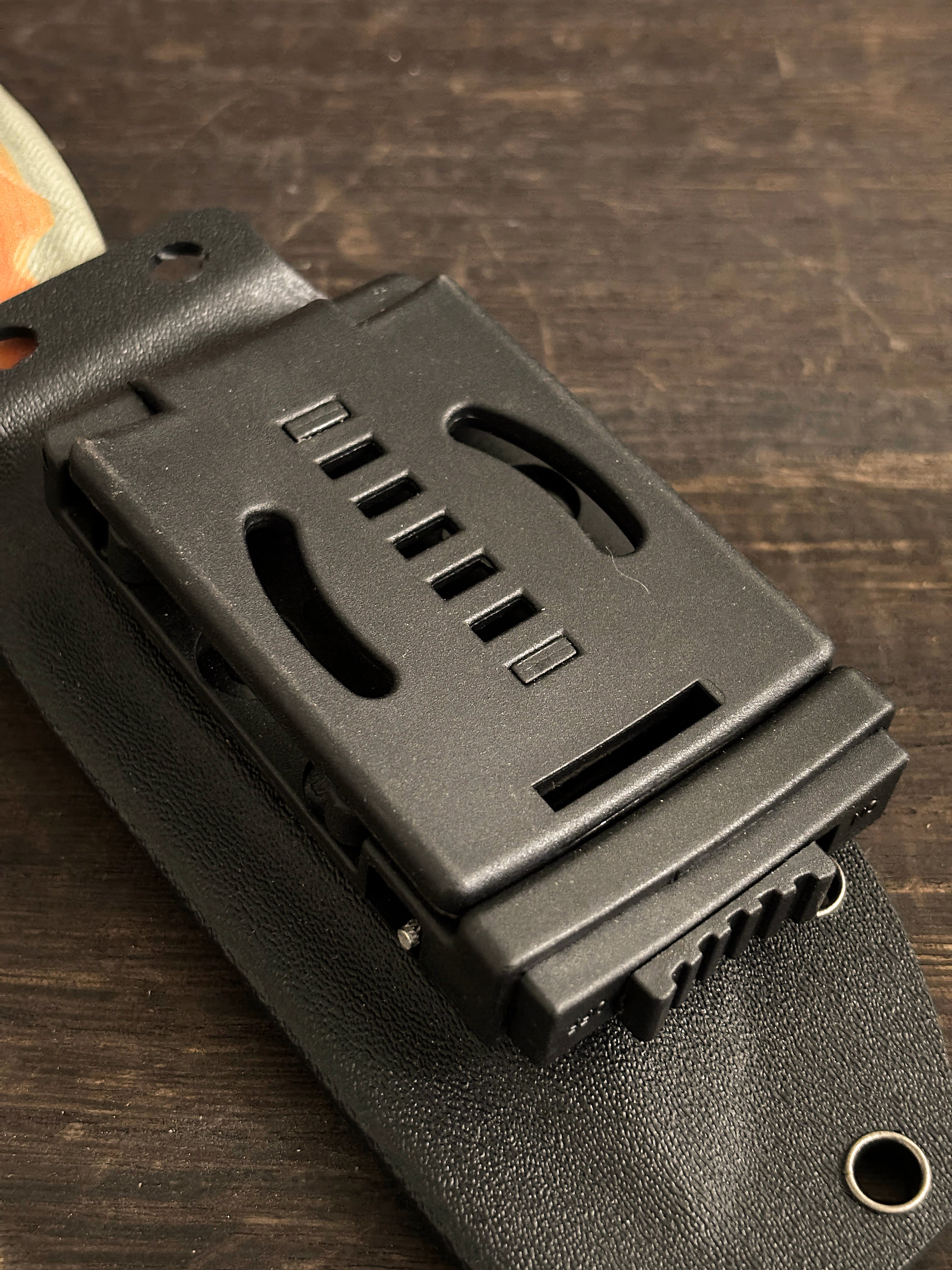 フィールドナイフ選びの欠かせない要素となる携行性にもこだわり、シースにはスライドしてロック、ブッシュしてオープンできるタクティカルギア発の高性能ベルトループを採用。ベルトループには計9カ所の取り付け穴が備わっているので、好みに応じてシースとの取り付け位置を変更することも可能です。シース素材には軽量高強度なカイデックスを採用。